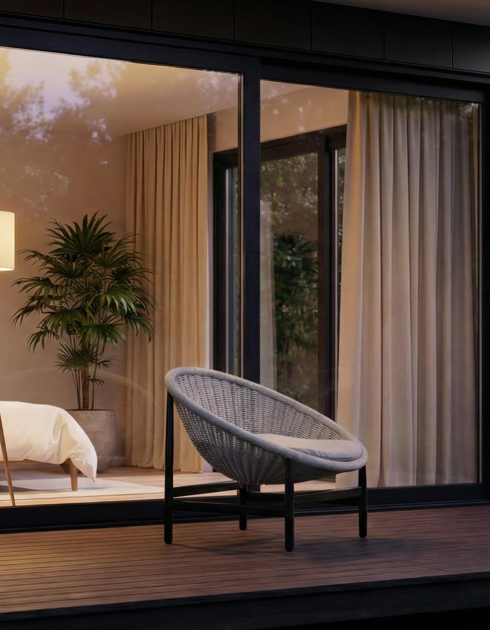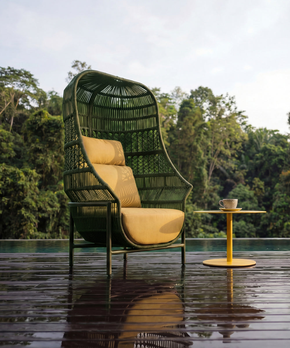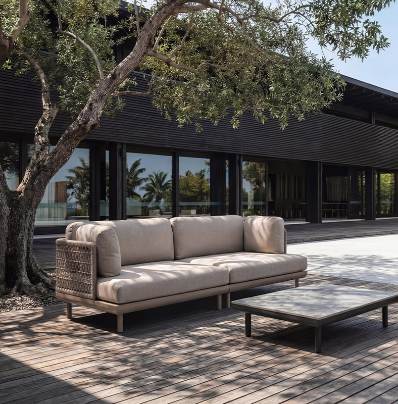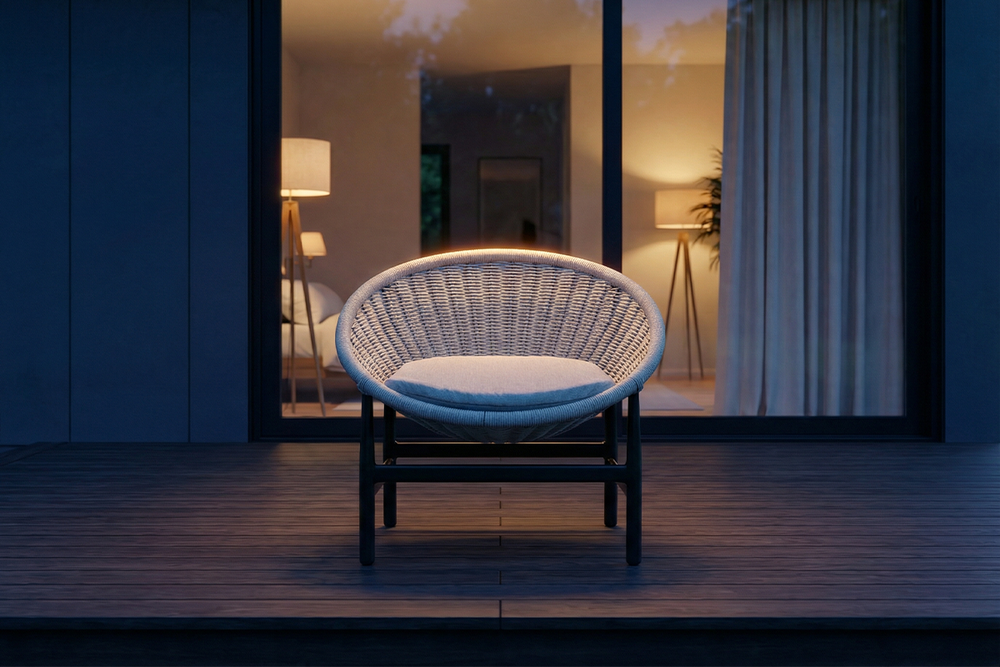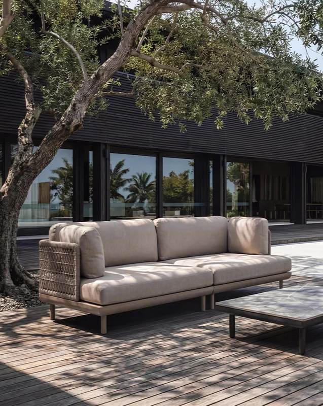 NU PLACEのガーデンファニチャーは屋内家具とは異なり、張地・ロープには撥水・耐UV素材を採用し、